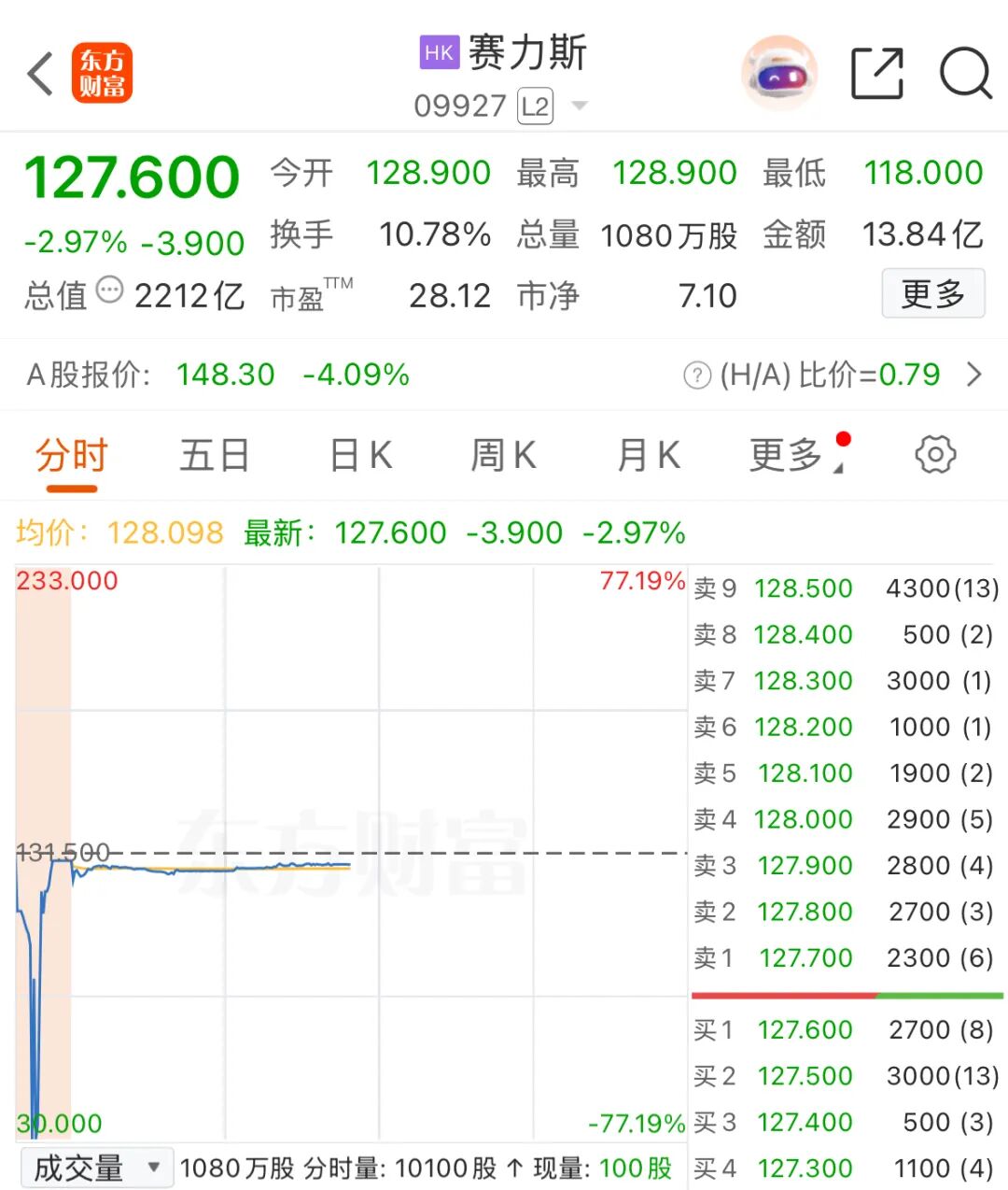 11月5日,賽力斯(09927.HK)在港交所主板掛牌,發(fā)行價為131.5港元/股,集合競價期間上演“驚魂時刻”,股價一度跌幅逾77%至30港元/股。不過最終開盤價為128.9港元,跌-1.98%。