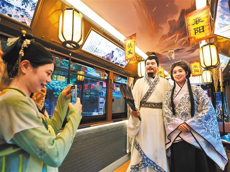 10月5日,湖北省襄陽市古隆中景區(qū),工作人員扮演影視劇角色在“俠義襄陽”旅游公交上與游客互動。楊 東攝(中經(jīng)視覺)