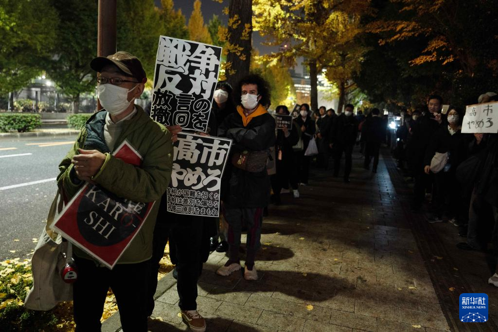 集會(huì)定于當(dāng)?shù)貢r(shí)間20時(shí)開(kāi)始。19時(shí)前后,便有民眾陸續(xù)趕到現(xiàn)場(chǎng)。抗議者們舉著寫有“撤回言論 反對(duì)戰(zhàn)爭(zhēng)”“因高市才有事”“高市下臺(tái)”等標(biāo)語(yǔ)的牌子,高喊“禁止軍國(guó)主義復(fù)燃”等口號(hào)。多名抗議者要求高市對(duì)其涉臺(tái)言論負(fù)責(zé)并辭去首相職務(wù)。