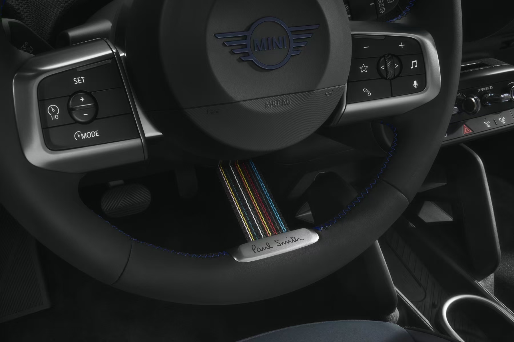 MINI PAUL SMITH 設(shè)計師款“內(nèi)心”更加叛逆,其內(nèi)飾中滿載“不被條條框框”的英式幽默。拉開門走進(jìn)內(nèi)飾,首先映入眼簾的是方向盤上一抹經(jīng)典的Paul Smith彩色條紋織帶和品牌銘牌,以低調(diào)地方式,恰到好處地給駕駛者帶來驚喜。入座后留心細(xì)看,就會進(jìn)一步發(fā)現(xiàn)新車儀表臺包裹了專屬暗調(diào)條紋織物,令人眼前一亮。裝飾有黑藍(lán)雙色織物和設(shè)計師簽名的龍葵藍(lán)Vescin運(yùn)動座椅,無聲宣示著這款座駕的獨(dú)特身份——這是一件不折不扣的設(shè)計師典藏之作。