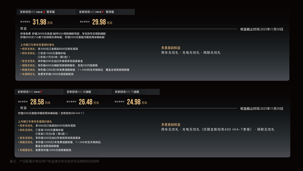 中國經(jīng)濟網(wǎng)11月7日訊(記者 郭濤)昨日,全新坦克400正式上市,推出Hi4-Z智享版、Hi4-T智享版、Hi4-T,以及柴油版和汽油版共5款車型,建議零售價為24.98萬至31.98萬元。